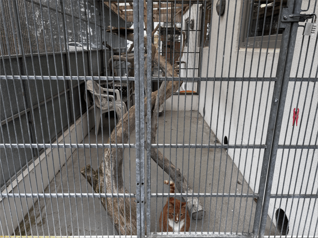 Rosa elsker at kunne gå ind og ud som det passer hende, så hun kan holde styr på fulgene udenfor. Herude kan hun også klatre, putte sig på- eller under stolen og der er ligeledes både vand og en kattebakke ude i volieren